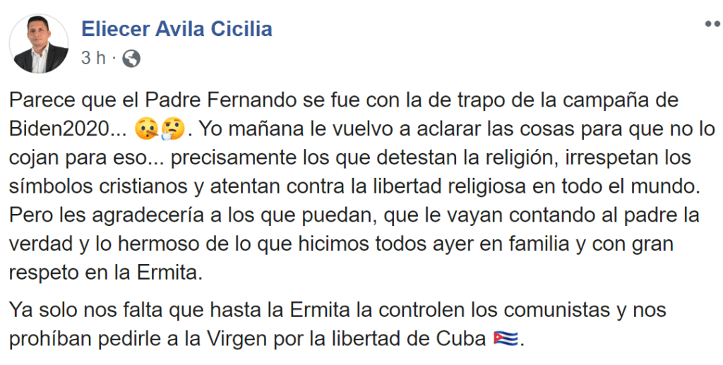 Eliécer Ávila fue inmediato en su respuesta (después de todo, había sido cuestionado su decoro…). Eliecer pidió que “le vayan contando al padre la verdad y lo hermoso de lo que hicimos todos ayer en familia y con gran respeto en la Ermita”, pero no sin quejarse de que “Ya sólo nos falta que hasta la Ermita la controlen los comunistas y nos prohíban pedirle a la Virgen por la libertad de Cuba…”.