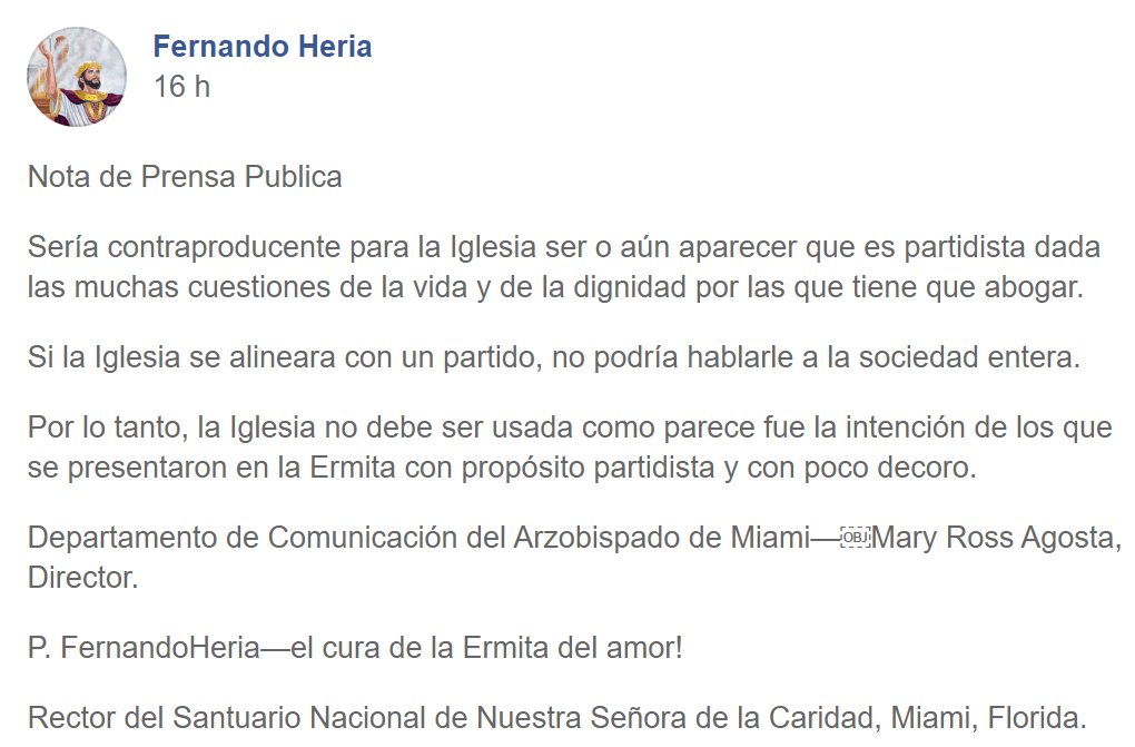 El Padre Fernando Heria, Rector del Santuario, se vió en la necesidad de divulgar una nota de prensa dos días después, para explicar que “…la Iglesia no debe ser usada como parece fue la intención de los que se presentaron en la Ermita con propósito partidista y con poco decoro”.